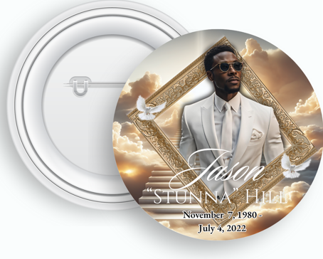 Honor your loved one with a personalized 3-inch button featuring their photo, name, and dates. A simple, wearable keepsake for services, repasts, or everyday remembrance.